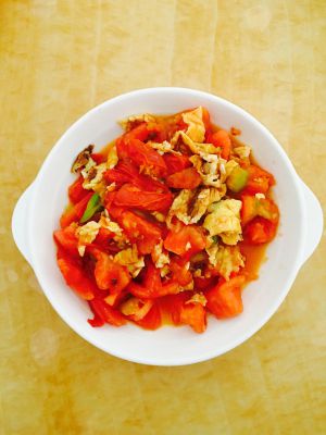 翻炒,依次放入糖盐,五分钟后西红柿变形出锅盛盘