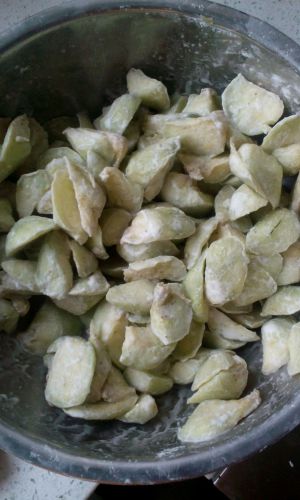 将刚才腌制的茄子撒上淀粉,裹匀。