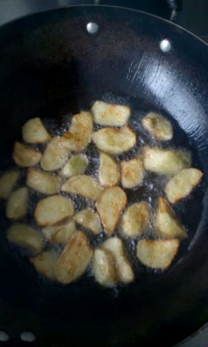 待油八成热,将茄子分多次放入,炸致金黄色捞出。