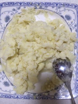 将蒸熟的土豆碾成泥,加入盐、五香粉和白胡椒粉,盐的量只够土豆就好了,白胡椒粉少加一些,提个味儿就ok。