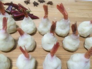 将虾包在里面,四周揉成团,然后放在砧板上转圈整形成土豆虾球生胚,全部做好备用。