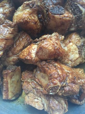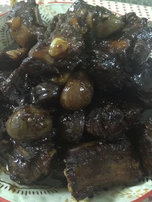 收汁之后,一道糖醋排骨就完成了,光线不是很好,所以有误差,我今天加了毛栗子在糖醋排骨里。