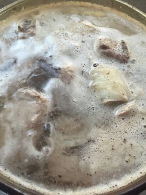第三步就准备开始煮排骨啦:把一部分生姜片,蒜苗丁,还有猪肋排放入热水里开中火煮大概15分钟左右;这时候锅里会出现很多沫子,这些都是排骨里的脏东西,所以准备勺子把这些沫子从锅里清除出去。