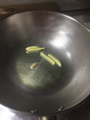 到3茶匙左右的食用油进行热锅,然后把剩下啦的生姜,蒜苗倒进油锅里翻炒1分钟左右;把排骨也倒进锅里进行翻炒,过油;如果觉得油太少,这时候可以再加点油进去了!