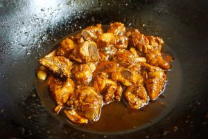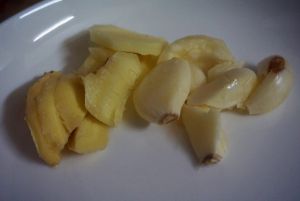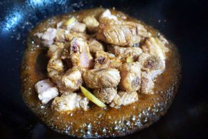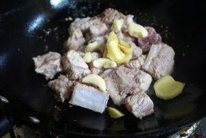 热锅热油,放入排骨,炒干血水,放入姜和蒜一起翻炒