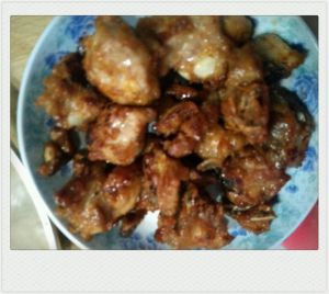 加入面粉和油炸粉,按1.1比例放。搅拌。锅中放油,9分热,放入微炸