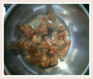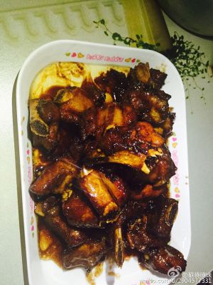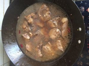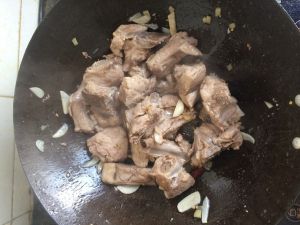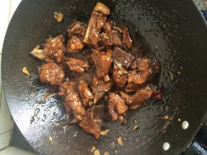 锅中放少量油,油熟时倒入淹制好的排骨,炒至排骨两面金黄色,倒入之前兑好的料,翻炒几下,再倒入之前的排骨汤,汤倒入平时吃饭的晚两碗的量,煮制完全收汁即可