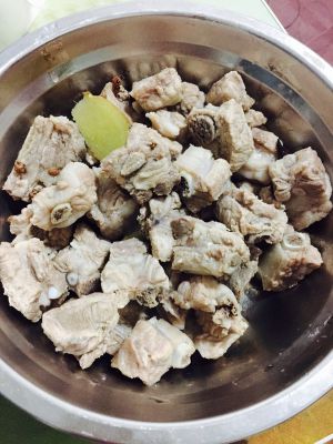 排骨放入烧好的开水中,放入2片姜,煮1~2分钟,待排骨全部微熟后盛出。