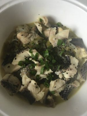 最后把煮开的薄鱼片也盛入碗,放上葱花,撒上芝麻,我们自己的酸菜鱼就完成啦……中间我只放了少许的盐。因为特意按孩子的口味来,所以这个酸菜鱼比较清口,我家孩子竖起大拇指来认同我的这一作品