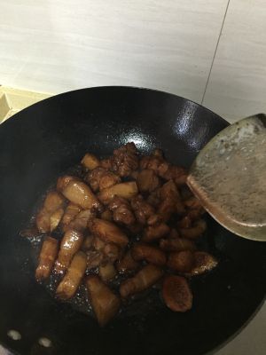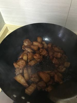 加入生抽、老抽,翻炒均匀。加适量水大火煮开,转小火慢炖30分钟。