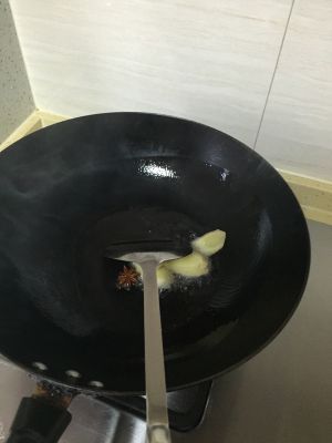 锅烧热加入食用油适量放入生姜和八角放入肥的那部分肉煸炒