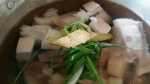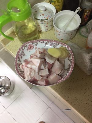 步骤忘了拍了,猪肉整块放电饭锅里的清水焖煮,放入生姜,猪肉颜色变后捞出,倒掉焖煮的水
