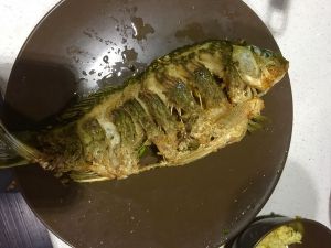 鱼洗净,表面抹上少许盐巴(以防黏锅);花生油((用猪油炸的话会到处溅))倒入锅中大火烧至高温放入鱼改中火炸十分钟。(火候大小要控制不要烧焦了)炸好以后装盘先放一边