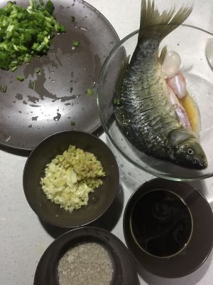 葱姜蒜切末,鱼洗净切几刀用料酒腌制十分钟,糖盐醋生抽味精调匀。