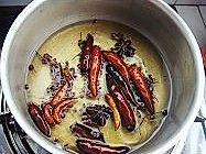 炒锅内倒入适量油烧热,然后放入花椒、辣椒,八角、桂皮,小火慢炸10分钟至出香气,捞出调料不要,油在锅里备用。