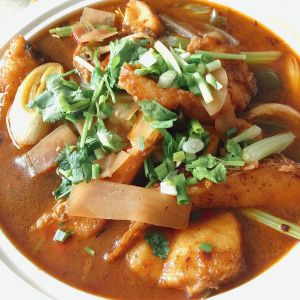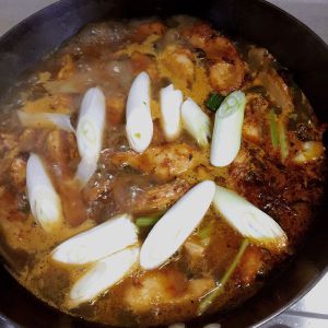 加入煎好的鱼段继续大火烧开,依次加入芹菜段,大葱再煮2分钟。(途中尽量不要翻动,避免鱼段破裂)