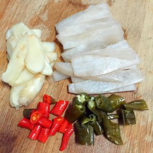 鱼肉片成3~5毫米的鱼片,鱼主刺剁成段,鱼头留下。将鱼片用蛋清,加少许盐,干淀粉和料酒,用手抓匀.