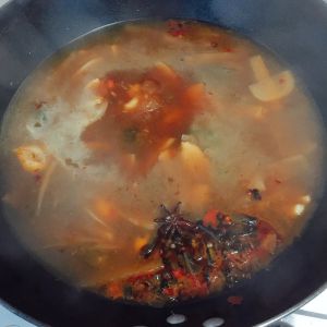 炒锅加油,放入泡椒、萝卜,花椒煸炒片刻,再加入一勺豆瓣酱小火炒出红油。加入清水或高汤,再加入一勺酱油,一颗八角烧开改小火熬汤使泡萝卜出味。