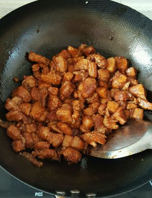 先放料酒炒,炒到料酒挥发地差不多了,再加生抽炒,炒一会儿再加红烧酱油炒,炒到五花肉上色~