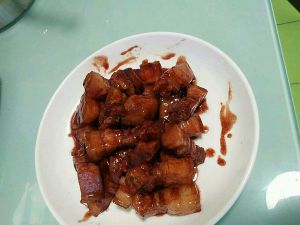 最后的味道以甜而不腻为基准,这道菜没有酱油,是毛式红烧肉做法,红酒是我自己加的,颜色鲜艳,肉质糯软。