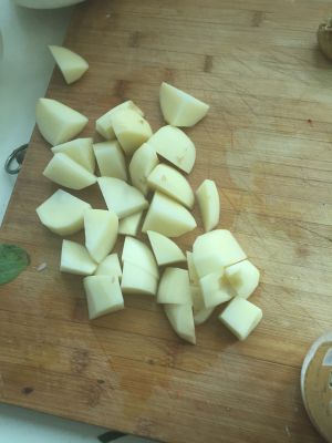 锅中倒入开水,以没过五花肉为准。煮开后,倒入酱油,小火煮20分钟,倒入土豆,再煮20分钟