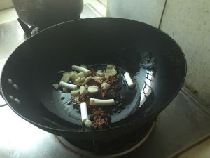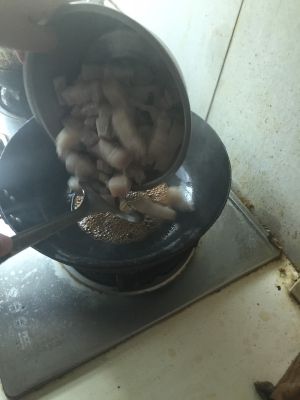 锅清洗干净,倒入少量油,加热,然后倒入提前备好的调料,炒出香味,再放入五花肉翻炒均匀