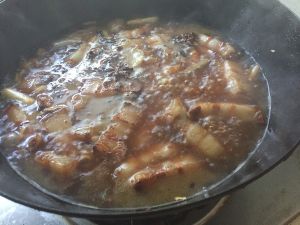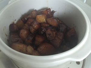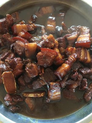 加入少许水加冰糖翻炒均匀,糖色略深后,加生抽,老抽,翻炒拌匀后,全部移入炖锅内,加水至五花肉的三分之二左右,大火烧开,小火慢炖1个半小时