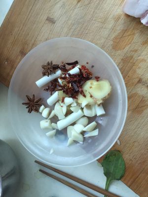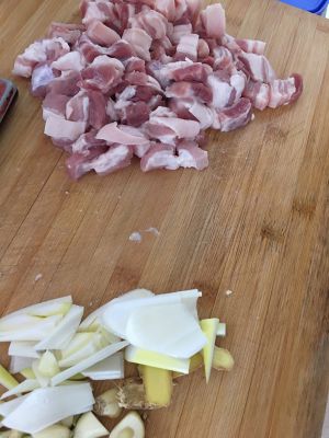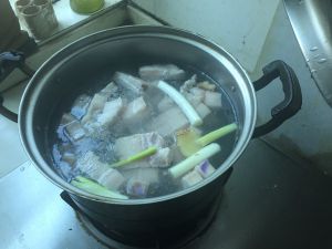 锅中放水,放入葱姜,煮开后将五花肉放入,煮到没有血色后捞出控干