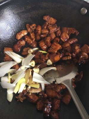 锅里倒入少许油加热 放入白糖炒到变成红色泡沫消失放入肉块炒上色然后在放入葱姜蒜在老抽盐鸡精五香粉 继续炒 加入水