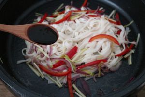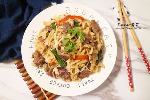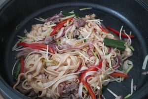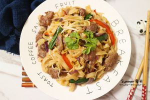 牛肉和蔬菜基本炒熟,放入准备好的河粉翻炒10至15秒。
