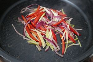 牛肉炒至七分熟,放入准备好的蔬菜。加入盐、糖、蚝油、生抽调味。