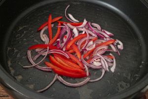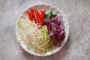 准备好食材,豆芽去掉根部,洋葱、红椒切丝,韭黄、蒜切段。