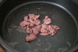 锅内放油,油热下牛肉翻炒加入料酒去腥。