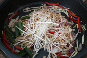 大火加油,河粉下锅,不要翻炒,要先煎一下,然后翻面煎一下,然后开始翻炒加入牛肉豆芽,把混合好的酱油倒进,有砂糖在低加一点水一起倒进去,翻炒把酱油均匀在河粉上,最后放入葱,起碟。