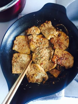 豆腐切厚片,大蒜剁碎;把酱油、香油、白糖、盐、百里香混合拌匀,加入适量清水备用。