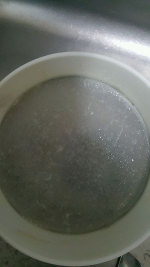 把鸡肉浆用80目或者100目的面筛。过筛。如果漏不下去请不停的敲打面筛边缘。这一步,真的会让你疯了。不停的敲敲敲敲。