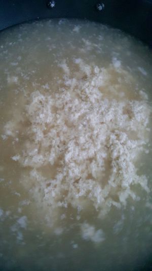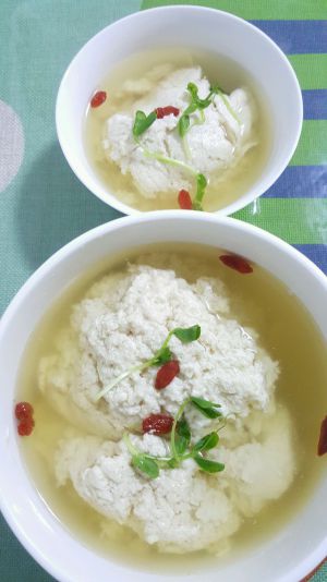 把熬好的高汤加热烧开,沿着顺时针方向旋转搅拌,呈漩涡状,即可开始慢慢地,少量地,均匀地把米汤状的蛋白鸡溶全部加进去,再次把水烧开,去掉漂浮的白沫浮沉即可。