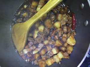 烧好的肉,平时我做红烧肉不放辣椒的,这次放是因为手误,把需要炒雪里红时才放的辣椒一同给倒进锅里了,郁闷!(不过这道菜好吃的原因还有一个,那就是要多放点辣椒的。)