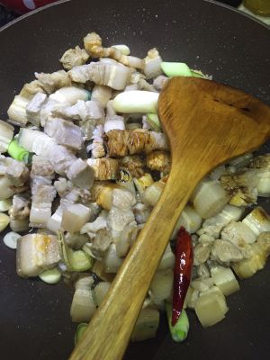 锅烧热,放一点点底油,再放入五花肉翻炒,小火就可以了,慢慢煸出五花肉的油,这样吃起来不腻
