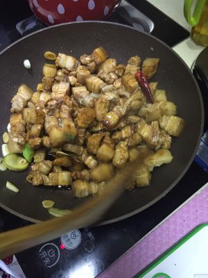放入五花肉 加入老抽 冰糖 翻炒均匀