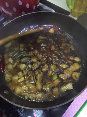 肉炒至变硬颜色有点泛焦黄后,加入适量老抽,生抽,翻炒均匀,再倒入开水,没过肉块,再调入白糖,盐,我喜欢略带甜味的,所以糖稍微多了点,盐不要太多,如果觉得味道淡的后面收汁时可以再加,再放入几块蒜瓣,大火烧开后中小火慢慢焖