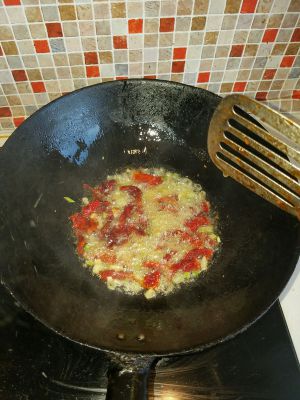 放入准备好的葱段,姜片,蒜,红辣椒,大料下锅