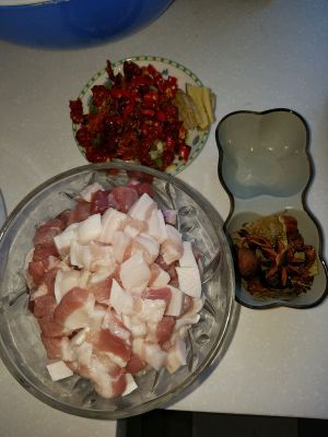 五花肉,葱姜辣椒适量,香叶八角草果各两三个