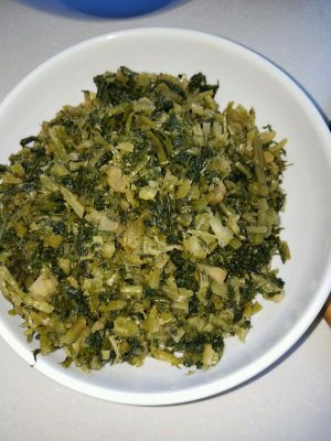 倒入雪里红翻炒,加少许糖,记住这倒菜不需要放盐了,因为菜已经很咸了,放少许糖可以中和一下还能味道更加鲜