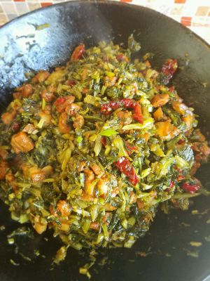 肉烧好后,开始炒雪里红了,先放葱和干辣椒炒香后
