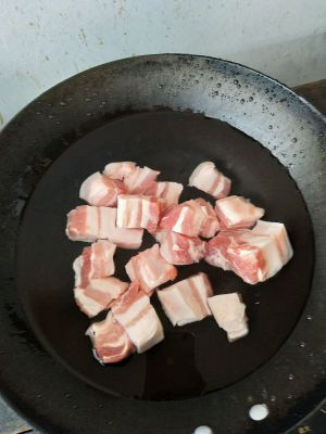 热锅,放油。将切好的肉块放入翻炒,等肉变色后,加入适量酱油,再翻炒几下。