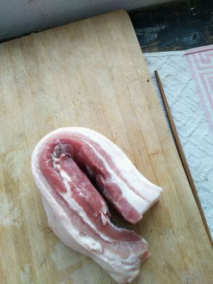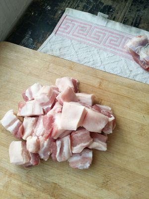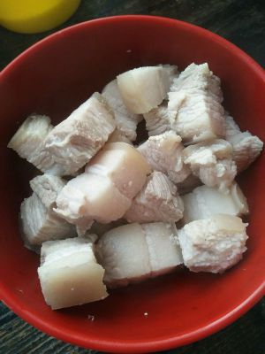 五花肉切大块放入煮葱姜的开水焯水3分钟,把焯好水的五花肉冲洗干净。