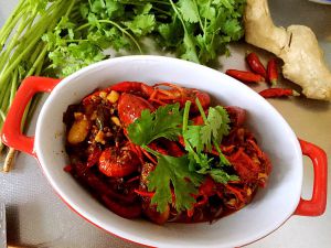 翻炒均匀后加啤酒(啤酒增香去腥),泡干辣椒的水亦可倒入