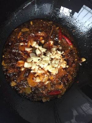 热锅放油,加入姜蒜、干辣椒(干辣椒提前泡过水,以免炒时焦)、花椒、香叶、豆瓣酱,翻炒出红油放入小龙虾