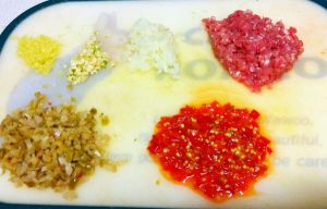 准备好做鱼香肉末榨菜的材料。洋葱末,姜末,蒜末,肥瘦肉丁,泡椒末,榨菜丁。洋葱末比葱末味道更香